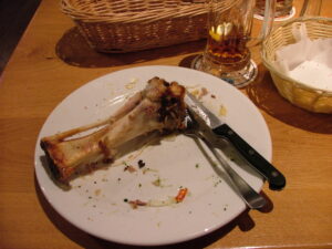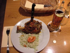 Danach sind wir gleich zum J. Albrecht Brauhaus gegangen. Als wir auf Peter gewartet haben, hatte ich eine Schweinehaxe bestellt. So eine grosse Haxe mit einem Messer kriegen wir nie in Taiwan. Siehst Du die ein Euro Muenze auf dem Tisch?